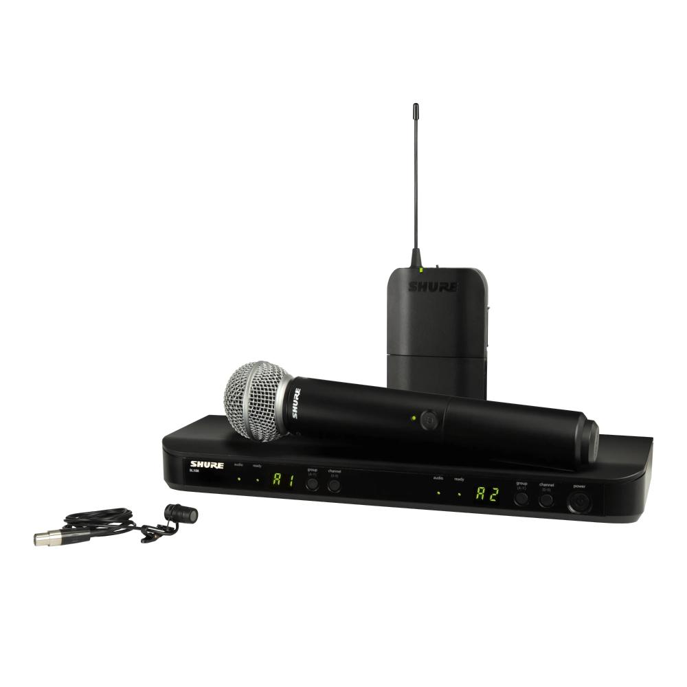 Микрофонная система SHURE [BLX1288E / CVL-M17] беспроводная, двухканальная, с ручным передатчиком PG58 и петличным микрофоном CVL-B / C. Частота UHF 662-686 МГц