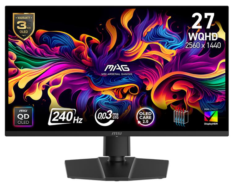 Монитор MSI MAG 271QP QD-OLED X24 26,5" 16:9 WQHD(2560x1440) QD-OLED Flat,True Black 400, 0.03ms(GTG), 1,5M:1, 250 nits, 2xHDMI, DP, Tilt,Swivel,Height,Pivot,VESA,240Hz,Black,1y w-ty