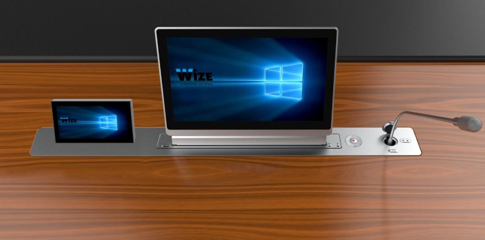 Моторизированный выдвижной монитор Brio Conference Wize Pro [WR-15BRC Touch] 15,6" c доп.7"монитором и лифтом для микрофона, накл. 0-30°,толщ. корп. 9 / 18мм,габарит. / устан. размеры 902х97х4 / 887х87мм,центр. / дистанц.управление,FullHD,черный