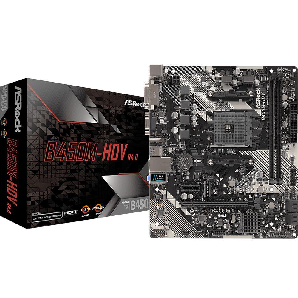 Материнская плата ASRock B450M-HDV R4.0, Socket AM4, AMD B450, 2xDDR4-2667, D-SUB+DVI-D+HDMI, 1xPCI-Ex16, 1xPCI-Ex1, 4xSATA3(RAID 0 / 1 / 10), 1xM.2, 8 Ch Audio, GLan, (2+4)xUSB2.0, (4+2)xUSB3.1, 1xPS / 2, mATX, RTL, {10} (337617)