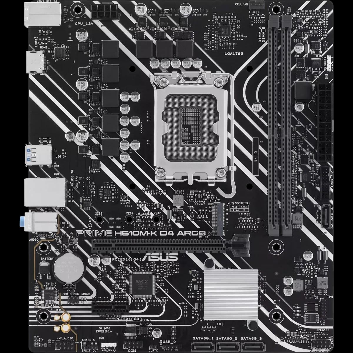 ASUS PRIME H610M-K D4 ARGB (Socket 1700, mATX, 2xDDR4(64GB), HDMI 2.1, 1xPCIe 4.0x16 / 1xPCIe 3.0 / 1xLAN, 4xSATA 6Gb / s, 1xM.2, 2xUSB 3.2, 4xUSB 2.0, 1xPS / 2)