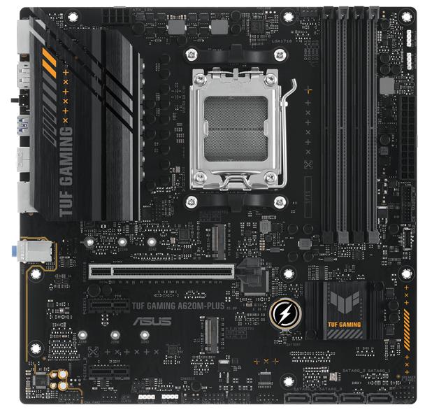 ASUS TUF GAMING A620M-PLUS (Socket AM5, mATX, 4xDDR5(128GB), 2xDP / HDMI, 1xPCIe 4.0x16 / 2xPCIe 3.0, 1xLAN (2.5GbE), 4xSATA 6Gb / s, 2xM.2, 2xUSB 3.2, 4xUSB 2.0, 1xPS / 2)
