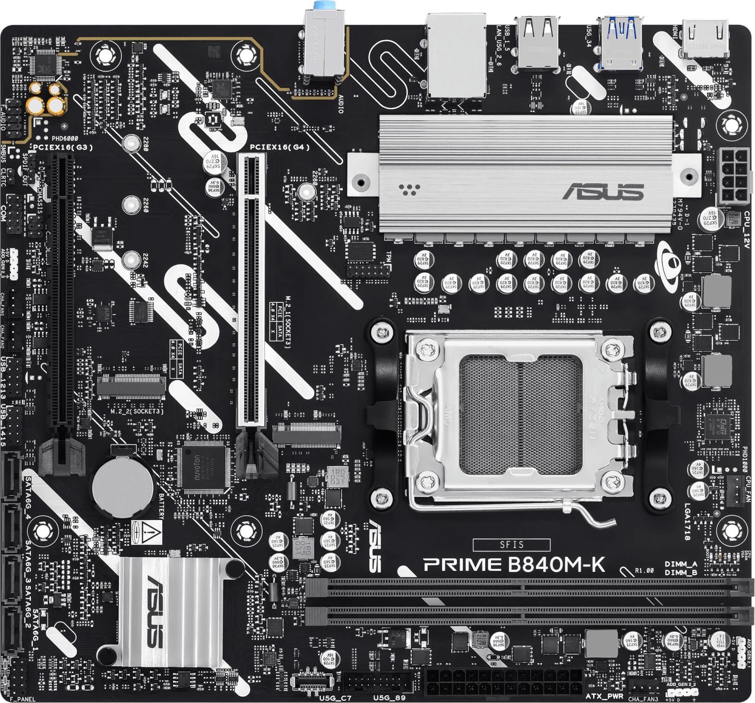 ASUS PRIME B850M-K (Socket AM5, mATX, 2xDDR5(128GB), DP / HDMI, 1xPCIe 5.0x16 / 1xPCIe 4.0x16, 1xLAN (2.5GbE), 4xSATA 6Gb / s, 2xM.2, 1xType-C, 4xUSB 3.2, 4xUSB 2.0, PS / 2)