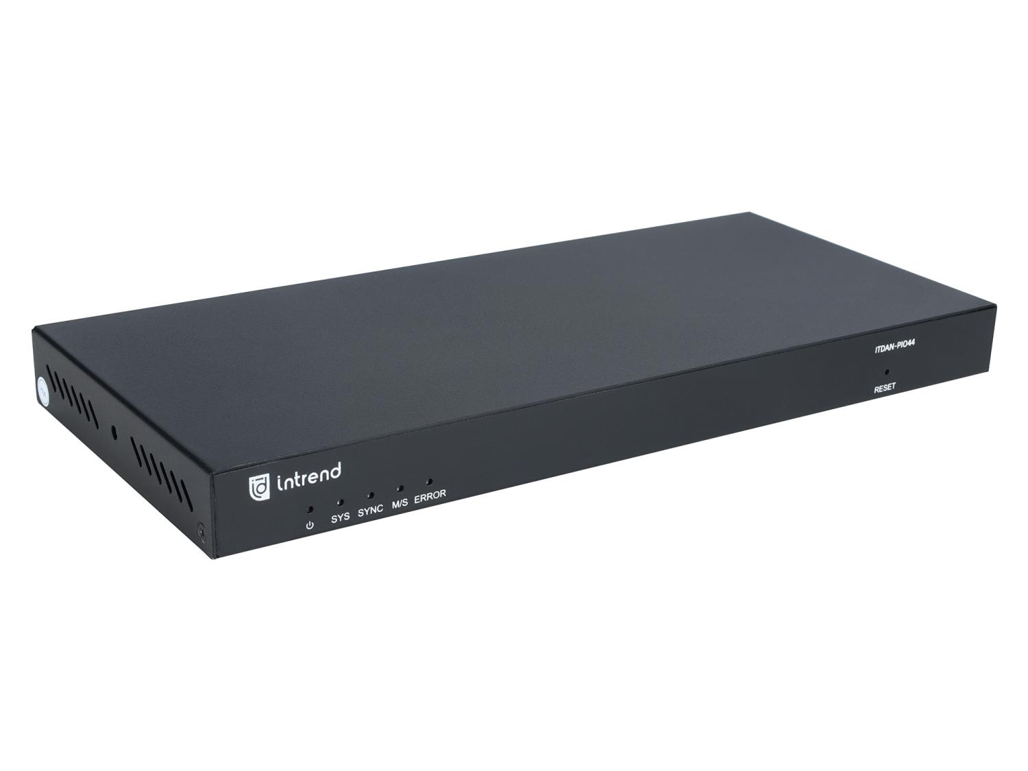 Конвертер Intrend [ITDAN-PIO44] Dante - аналог. 4 входа / 4 выхода phoenix, 2xRJ45(Dante). Встроенный аудиопроцессор (gain, phantom power, mute). Каскадирование через LINK. Питание 12V / POE