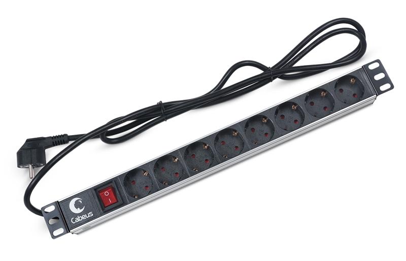 Cabeus PDU-8P Блок евророзеток для 19" шкафов, горизонтальный, 8 розеток, 10 A, выключатель, гнездо под шнур, алюминиевый корпус