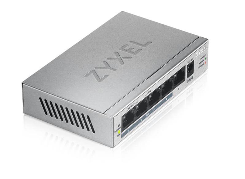 Коммутатор PoE+ Zyxel GS1005HP, 5xGE (4xPoE+), настольный, металлический, бесшумный, бюджет PoE 60 Вт