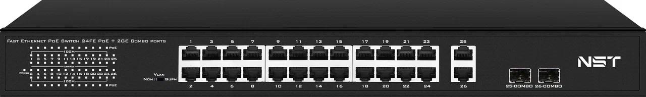 PoE коммутатор Fast Ethernet / PoE коммутатор Fast Ethernet на 24 x RJ45 портов + 2 x GE Combo uplink порта. Порты: 24 x FE (10 / 100 Base-T) с поддержкой PoE (IEEE 802.3af / at), 2 x GE Combo Uplink (RJ45 + SFP). Соответствует стандартам PoE IEEE 802.3af / at.