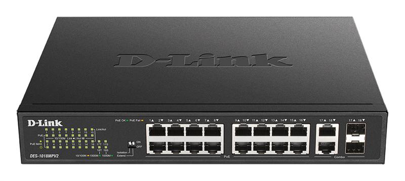 Коммутатор D-Link Unmanaged Switch 16x100Base-TX PoE, 2xCombo 1000Base-T / SFP, PoE Budget 247W, Long-range PoE up to 250m, metal case