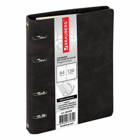 Тетрадь на кольцах БОЛЬШАЯ А4 (240х310 мм), 120 листов, под кожу, клетка, BRAUBERG "Main", черный, 404509