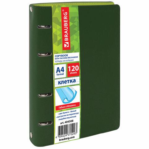 Тетрадь на кольцах БОЛЬШАЯ А4 (240х310 мм), 120 листов, под кожу, клетка, BRAUBERG "Joy", зелёный / светло-зелёный, 404508