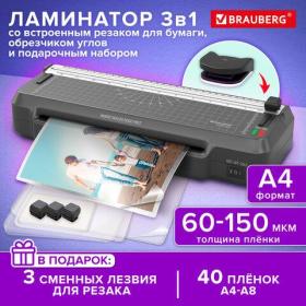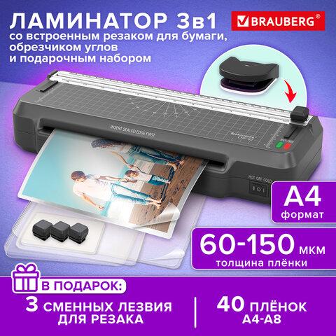 Ламинатор 3 в 1 BRAUBERG CHF-02, А4, 60-150 мкм, 30 см / мин, со встроенным резаком и обрезчиком углов, В ПОДАРОК набор пленок 40 шт., 532862