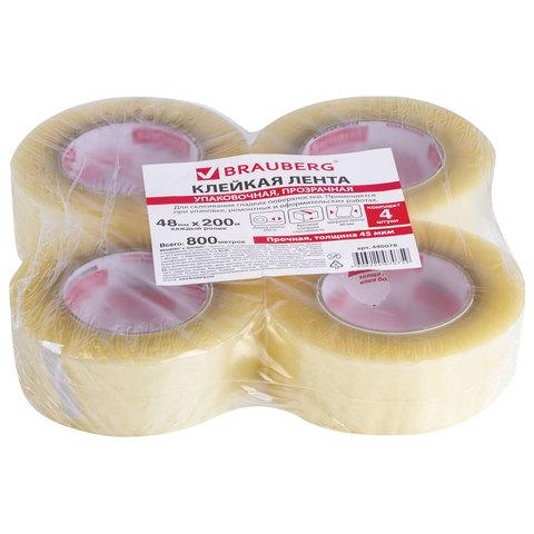Клейкие ленты упаковочные, 48 мм х 200 м, КОМПЛЕКТ 4 шт., прозрачные, толщина 45 микрон, BRAUBERG, 440078