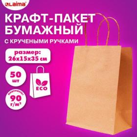 Крафт-пакет бумажный 26х15х35 см, КОМПЛЕКТ 50 шт., крученые ручки, плотность 90 г / м2, LAIMA ECO CRAFT, 609686