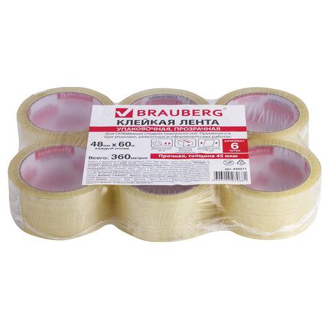 Клейкие ленты упаковочные, 48 мм х 60 м, КОМПЛЕКТ 6 шт., прозрачные, толщина 45 микрон, BRAUBERG, 440071