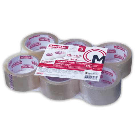 Клейкие ленты упаковочные, 48 мм х 60 м, КОМПЛЕКТ 6 шт., прозрачные, толщина 45 микрон, ОФИСМАГ, 440070