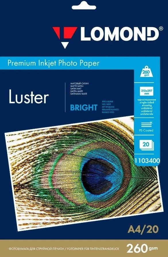 Фотобумага ПРЕМИУМ для стр.печати LOMOND 20л А4 260 г / м2 односторонняя Bright Luster