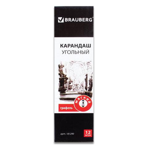 Карандаш (1 штука) угольный BRAUBERG ART CLASSIC, МЯГКИЙ, круглый, корпус черный, заточенный, 181290