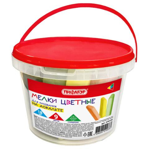 Мел в ведерке для рисования на асфальте 18 штук, ПИФАГОР, цветной квадратный УТОЛЩЕННЫЙ, 274124