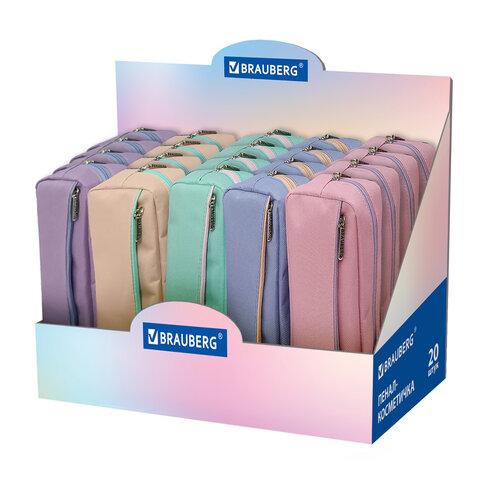 Пенал мягкий BRAUBERG, 2 отделения, ассорти 5 цветов, "Pastel", 21х9,5х5 см, дисплей, 271579