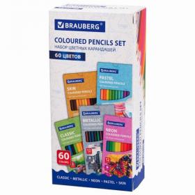 Карандаши цветные BRAUBERG, 60 цветов (Базовые, Металлик, Неон, Пастель, Телесные), трехгранные, грифель 3 мм, натуральное дерево, 181792