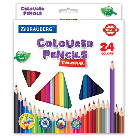 Карандаши цветные BRAUBERG PREMIUM, 24 цвета, трехгранные, грифель 3,3 мм, натуральное дерево, 181653
