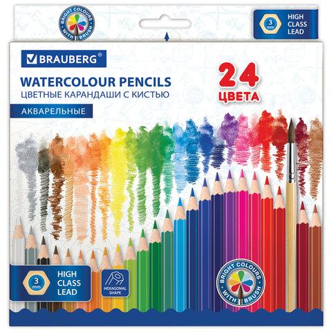 Карандаши цветные акварельные BRAUBERG 24 цвета с КИСТЬЮ, шестигранные, грифель 3 мм, натуральное дерево, 181849