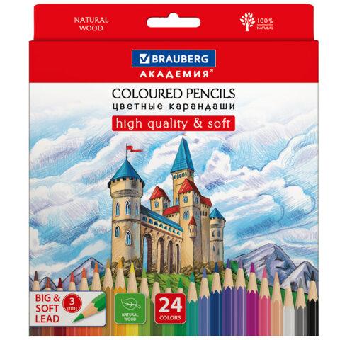 Карандаши цветные мягкие BRAUBERG АКАДЕМИЯ, 24 цвета, шестигранные, грифель 3 мм, натуральное дерево, 181866