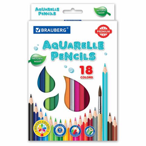 Карандаши цветные акварельные BRAUBERG PREMIUM AQUARELLE, 18 цветов, трехгранные, утолщенный грифель 4 мм, натуральное дерево, 181672