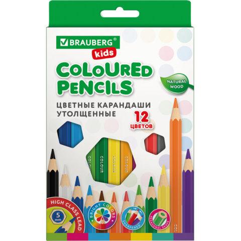 Карандаши цветные утолщенные BRAUBERG KIDS, 12 цветов, шестигранные, грифель 5 мм, натуральное дерево, 181878