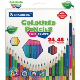 Карандаши цветные двусторонние BRAUBERG PREMIUM TWIN COLOUR, 24 штуки, 48 цветов, шестигранные, грифель 3,3 мм, натуральное дерево, 181875