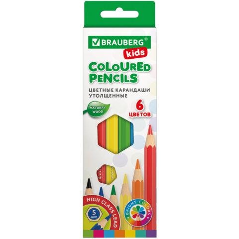 Карандаши цветные утолщенные BRAUBERG KIDS, 6 цветов, шестигранные, грифель 5 мм, натуральное дерево, 181877