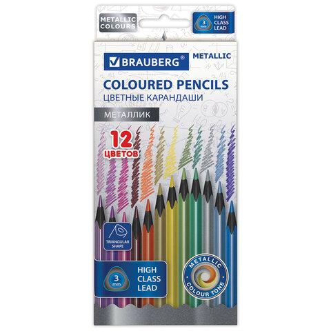 Карандаши цветные BRAUBERG METALLIC, 12 цветов металлик, трехгранные, грифель 3 мм, черное дерево, 181853