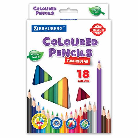 Карандаши цветные BRAUBERG PREMIUM, 18 цветов, трехгранные, грифель 3,3 мм, натуральное дерево, 181652