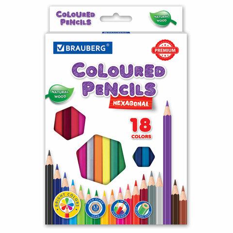 Карандаши цветные BRAUBERG PREMIUM, 18 цветов, шестигранные, грифель 3,3 мм, натуральное дерево, 181657