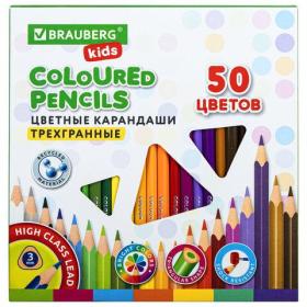 Карандаши цветные BRAUBERG KIDS, 50 цветов, трехгранные, грифель 3 мм, 181946