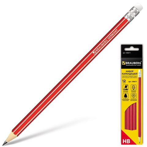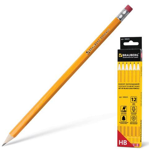 Карандаши чернографитные простые с ластиком HB, ВЫГОДНАЯ УПАКОВКА КОМПЛЕКТ 12 штук, BRAUBERG, 180635