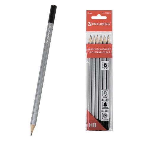 Карандаши чернографитные BRAUBERG НАБОР 6 шт., "Argentum", НВ, без резинки, заточенные, полибэг, 180605