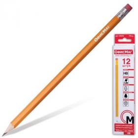 Карандаши чернографитные простые с ластиком HB, ВЫГОДНАЯ УПАКОВКА КОМПЛЕКТ 12 штук, ОФИСМАГ, 180638