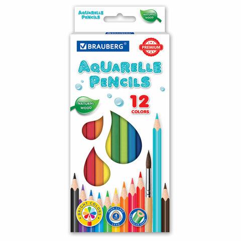 Карандаши цветные акварельные BRAUBERG PREMIUM AQUARELLE, 12 цветов, трехгранные, утолщенный грифель 4 мм, натуральное дерево, 181671