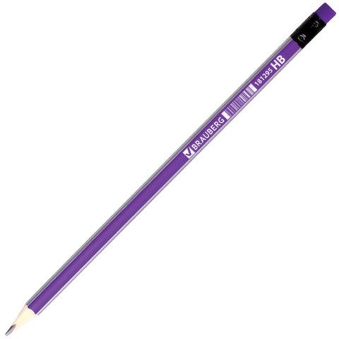 Карандаш чернографитный BRAUBERG, 1 шт., "Lines", HB, трехгранный, с ластиком, фиолетовый / серебристый, 181295