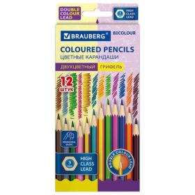 Карандаши с двухцветным грифелем BRAUBERG BICOLOUR, 12 штук, 24 цвета, шестигранные, грифель 3 мм, натуральное дерево, 181855