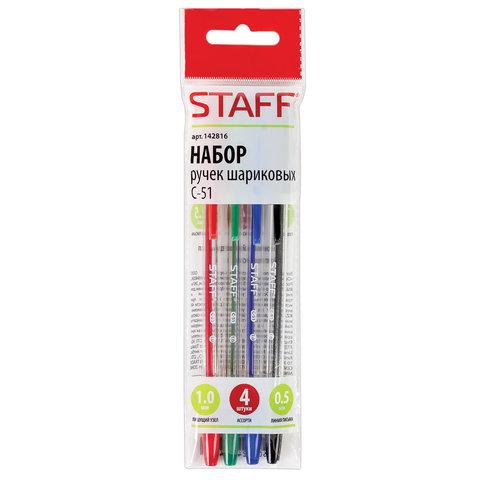 Ручки шариковые STAFF "C-51", НАБОР 4 шт., АССОРТИ, узел 1 мм, линия письма 0,5 мм, 142816