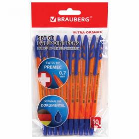 Ручки шариковые BRAUBERG "ULTRA ORANGE", СИНИЕ, НАБОР 10 штук, корпус оранжевый, узел 0,7 мм, 143571