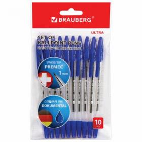 Ручки шариковые BRAUBERG "ULTRA", СИНИЕ, НАБОР 10 штук, корпус прозрачный, узел 1 мм, 143570