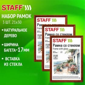 Рамка 21х30 см со стеклом, КОМПЛЕКТ 3 штуки, багет 17 мм, дерево, STAFF "Classic", темно-коричневая, 391390