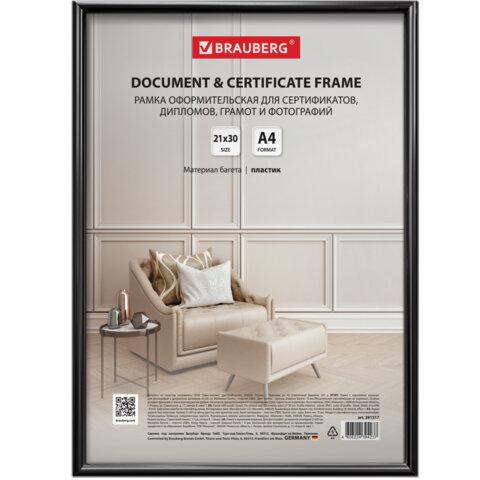 Рамка 21х30 см черная, пластик, багет 8 мм, BRAUBERG "Slim", плотный задник с ножкой, акриловый экран, 391317