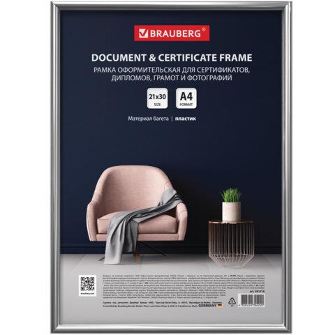 Рамка 21х30 см небьющаяся, багет 15 мм пластик, BRAUBERG "Respect", серебристая, 391271