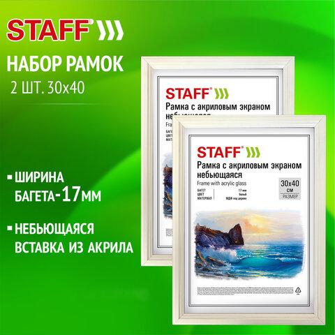 Рамка 30х40 см небьющаяся, КОМПЛЕКТ 2 шт., багет 17 мм, МДФ под дерево, STAFF "Carven", белая, 391329