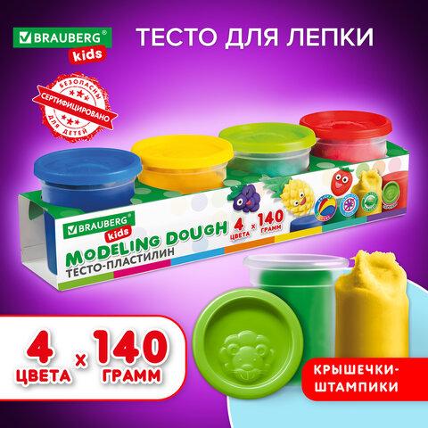 Пластилин-тесто для лепки BRAUBERG KIDS, 4 цвета, 560 г, яркие классические цвета, крышки-штампики, 106715