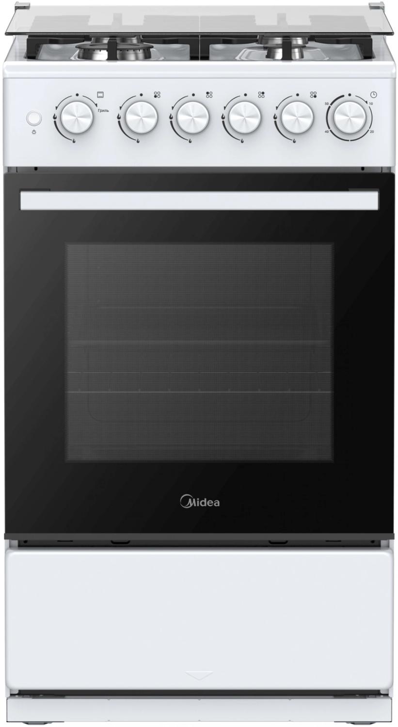 Газовая плита Midea, отдельностоящая, газовая варочная панель, 4 конфорки, автоподжиг, газконтроль, механический таймер (50 мин), объем дух. шкафа 59 л, цвет белый